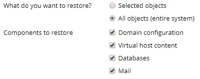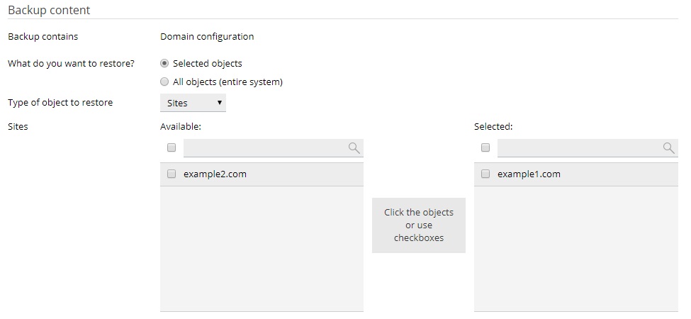 When restoring from a backup file, you can restore all data contained in the backup, or select individual objects to be restored (for example, a particular site, all databases, and so on).