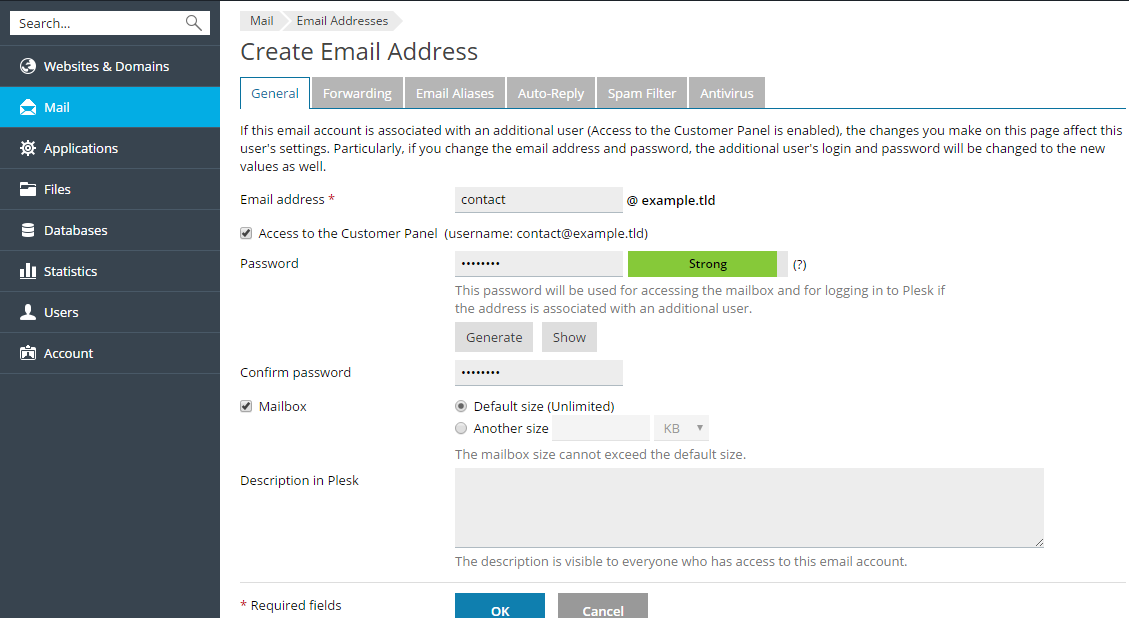 Description in Plesk. You can add additional information about the email address. This information will be displayed in the list of email addresses on the Mail section of your subscription. The hosting provider and anyone who has access to this mailbox will be able to view this description.