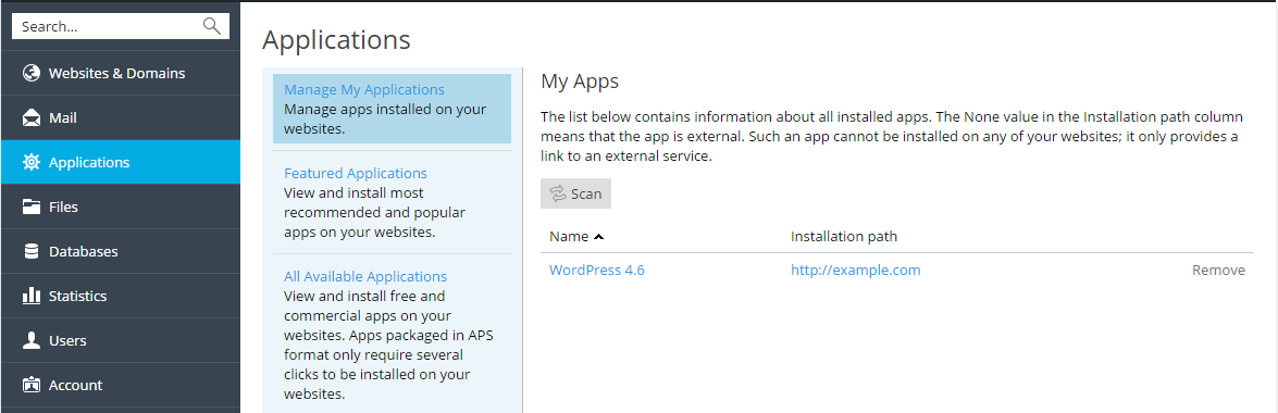 If WordPress Toolkit is installed on the server, users are advised to use it for centralized management of WordPress installations on the server. Learn more in the section WordPress Toolkit.