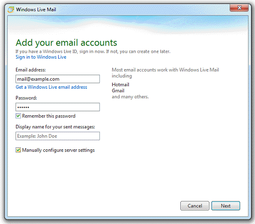 Type in your email address and password and select the Manually configure server settings checkbox.