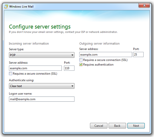 - Logon user name. Type in the name of your email account, for example, mail@example.com.