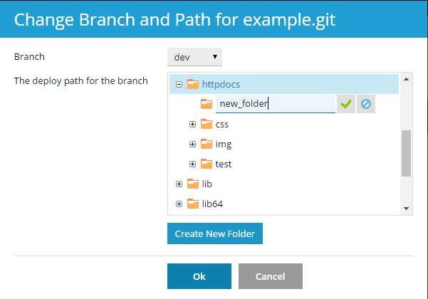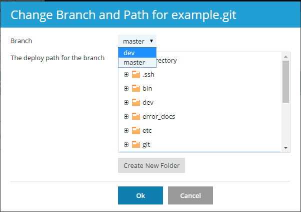Now you can select one of two active branches. Go to Websites & Domains > Git, click the Change branch and path link, and in the opened window select the branch name in the Branch menu.