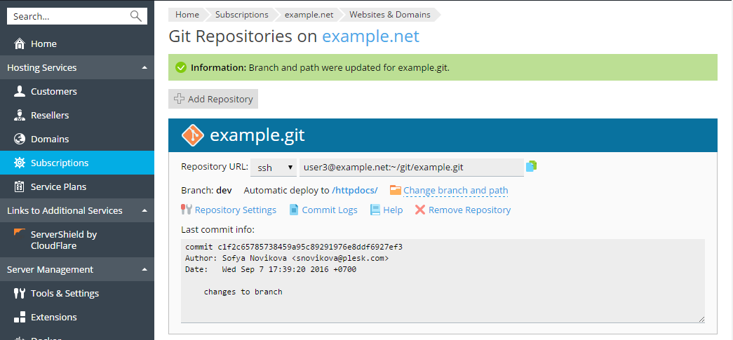 When the repository is initialized, you can see the commit information and the active branch name at Websites & Domains > Git. By default, the master branch is used to work with Plesk. You can add more branches later (see the Change Branch or Path section).