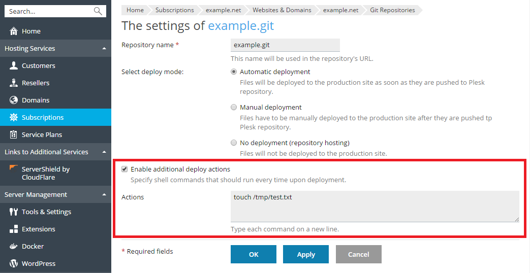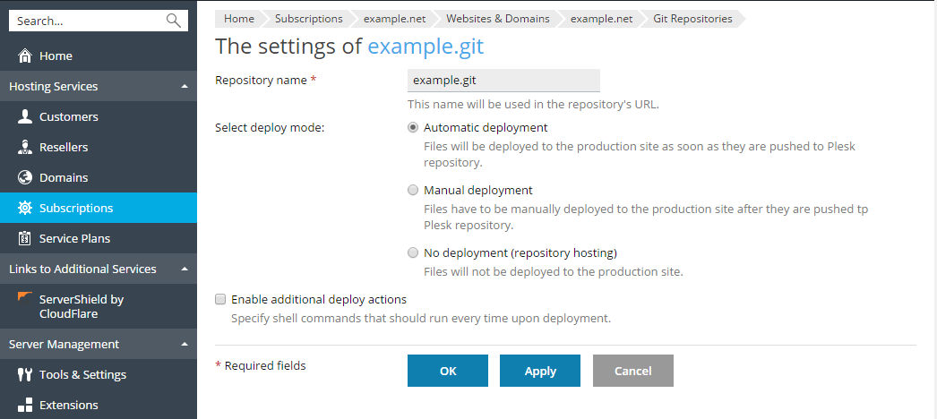 By default, Plesk uses the Automatic deployment mode. This means that after a file is pushed to the repository, it is immediately deployed to the target directory (you can switch off this mode if necessary, see the Select Deploy Mode section).