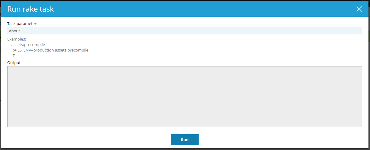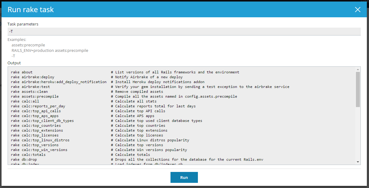 This functionality is available if the application contains a Rakefile that describes available Rake tasks (for details, refer to the Rakefile format documentation). It is a good practice to have the ‘rake’ gem listed in a Gemfile.