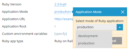 Application Mode. Ruby applications can run in several modes that are defined in the application code. Usually, the following modes are used: ‘development’, ‘test’, and ‘production’. Each of them has its specific features. For example, the ‘development’ mode produces some debug information in the log files, and the ‘production’ mode can activate caching. Click the current Application Mode value to select a different mode or to define a custom mode.