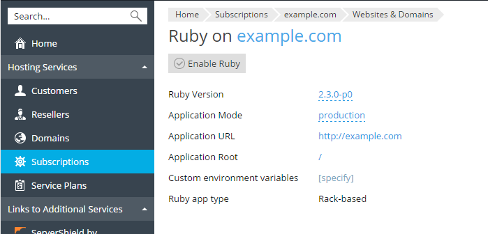 The Ruby interpreter of the selected version will be enabled for your web site, and the version number will be displayed at the Websites & Domains page near the Ruby icon.