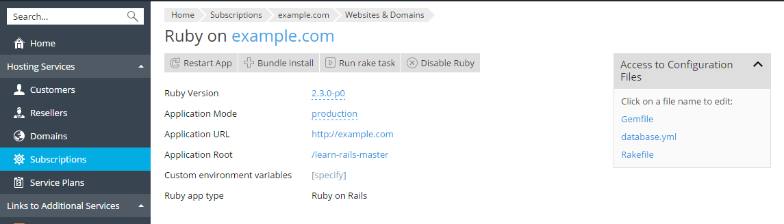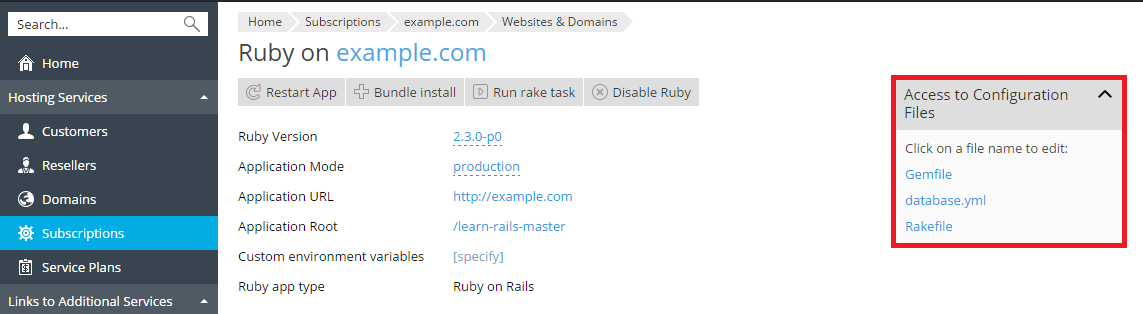 Plesk provides you with quick links to the most used configuration files of the application. You can edit these files to define custom settings. For example, you can edit the Gemfile listing the gems required by the application.