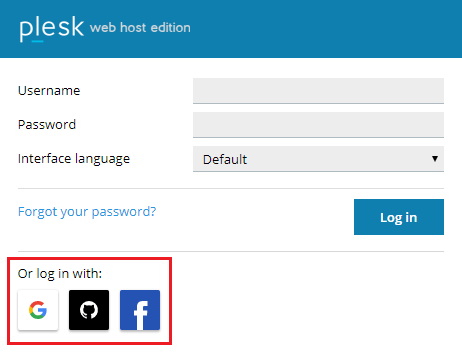 You can log in to Plesk with your Google, GitHub, and Facebook accounts. This does not take away the ability to log in with the Plesk username and password.