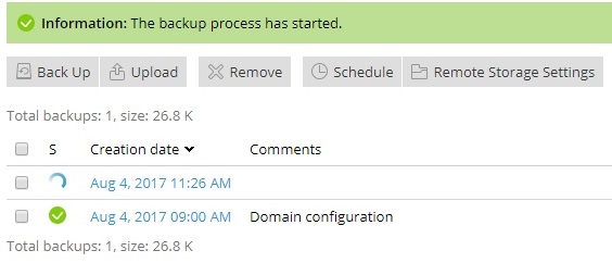 You will be returned to the Websites & Domains > Backup Manager screen where you can see the backup being created. The backup process can take some time to finish, depending on the size of the content you chose to back up during step 2. Once the backup is created, you can find it here.
